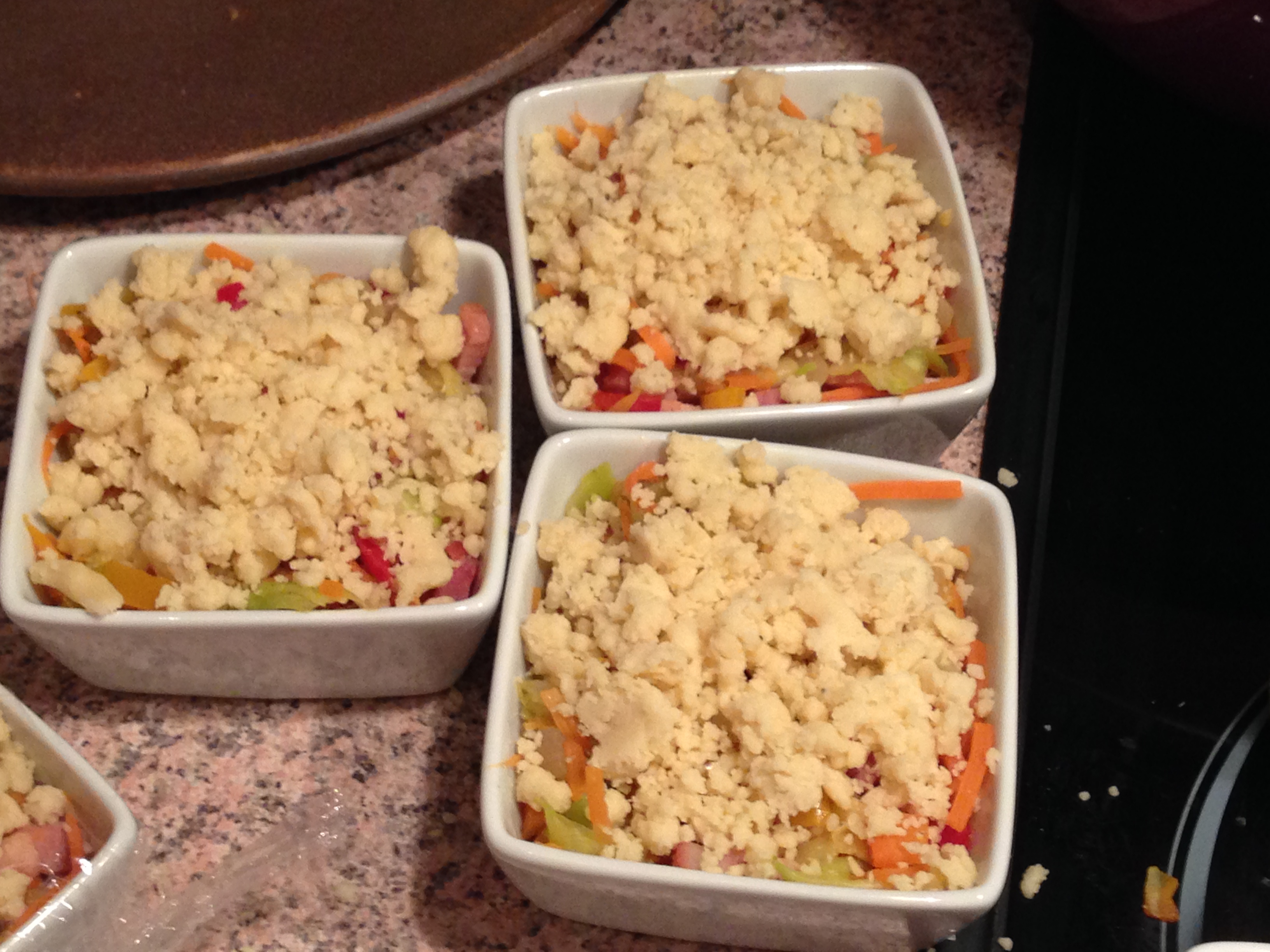 • Mélanger ensuite les lardons et les légumes et les disposer dans un plat à gratin ou des ramequins puis ajouter la pâte à crumble au dessus