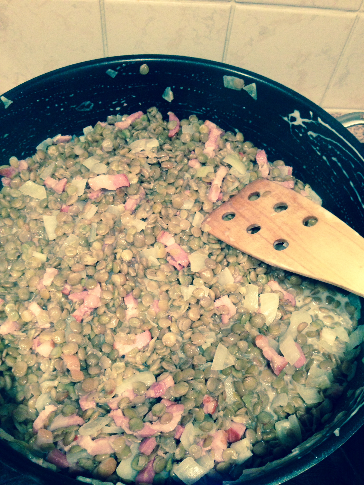 On ne mange pas beaucoup de lentilles. Avant, pour moi, le mot « lentilles » rimait avec salade ou lentilles saucisses (moi qui aime changer souvent les manières de cuisiner les aliments). Puis pour changer un peu de cette façon de les cuisiner, eh bien pourquoi pas les lentilles carbo, enfin plutôt des lentilles à la crème car il n’y a pas de trace d’œuf ici.