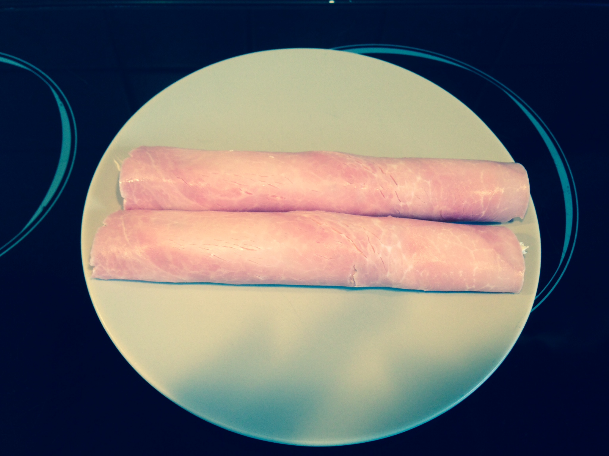 - Rouler les tranches de jambon puis les couper en tronçon d’environ 2 cm