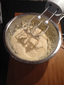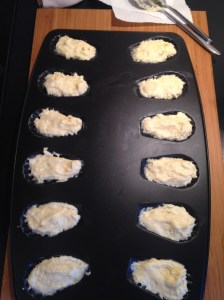 - Une fois le four préchauffer, sortir la préparation du réfrigérateur (la texture est un peu mousseuse, c’est normal) et verser une bonne cuillère à café de pâte dans chaque empreinte ( de manière à faire 24 madeleines) préalablement beurrées