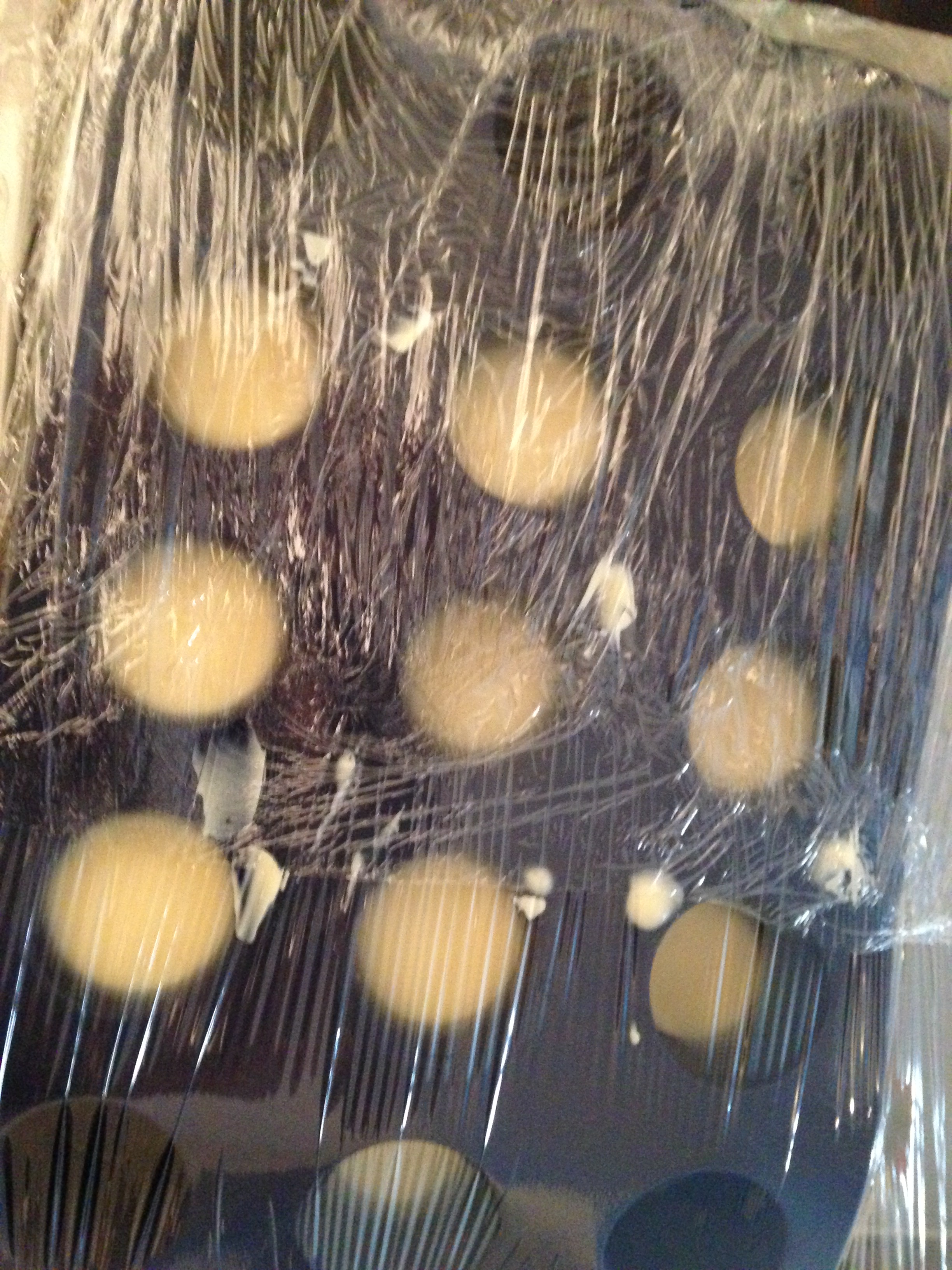 • Verser la crème anglaise  dans des bacs à glaçon ou des moules à mini muffin en Silicon  ( à déposer préalablement sur un plateau pour ne rien renverser, vous allez les transporter jusqu’au congélateur ;)), protéger avec du film alimentaire, laisser totalement refroidir et placer au moins 10 heures au congélateur