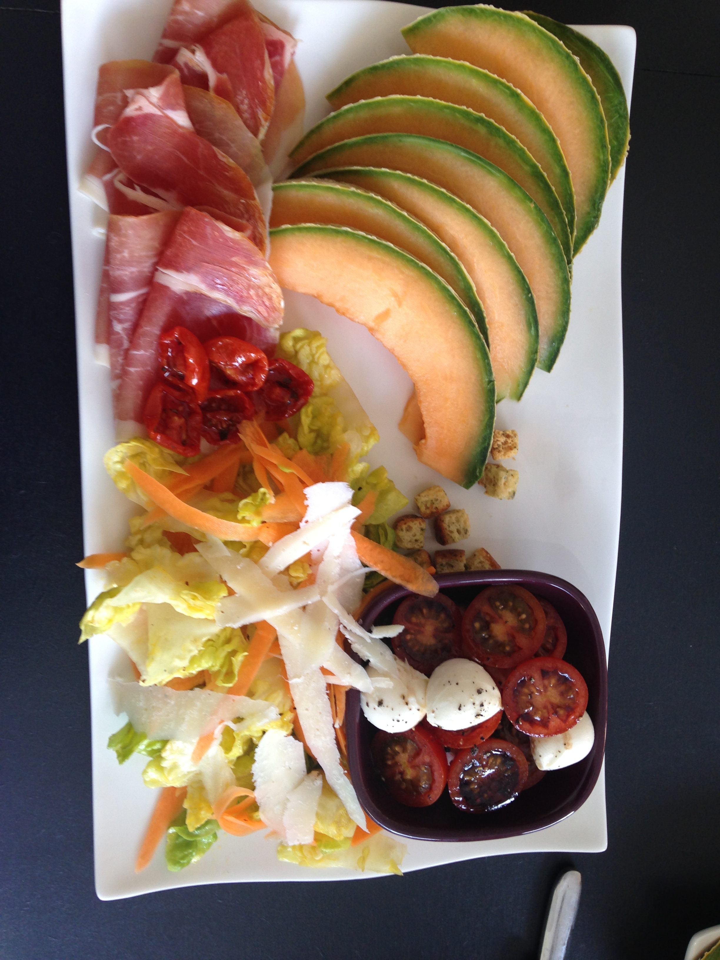 - Finir de dresser l’assiette. Dans un ramequin déposer les demies tomates cerises et les billes de mozzarella jusqu’à remplir le petit récipient. Déposer à côté la sucrine et les tagliatelles de carottes assaisonnées. Parsemer de pignon de pin, de croûtons à salade et de copeaux de parmesan. Finir par déposer quelques tomates séchées ou demi confites sur le jambon cru