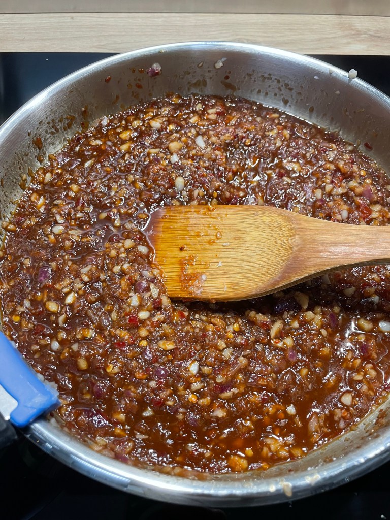 - Coupe très finement ou aidez vous d’un robot mixeur afin de gagner un temps précieux