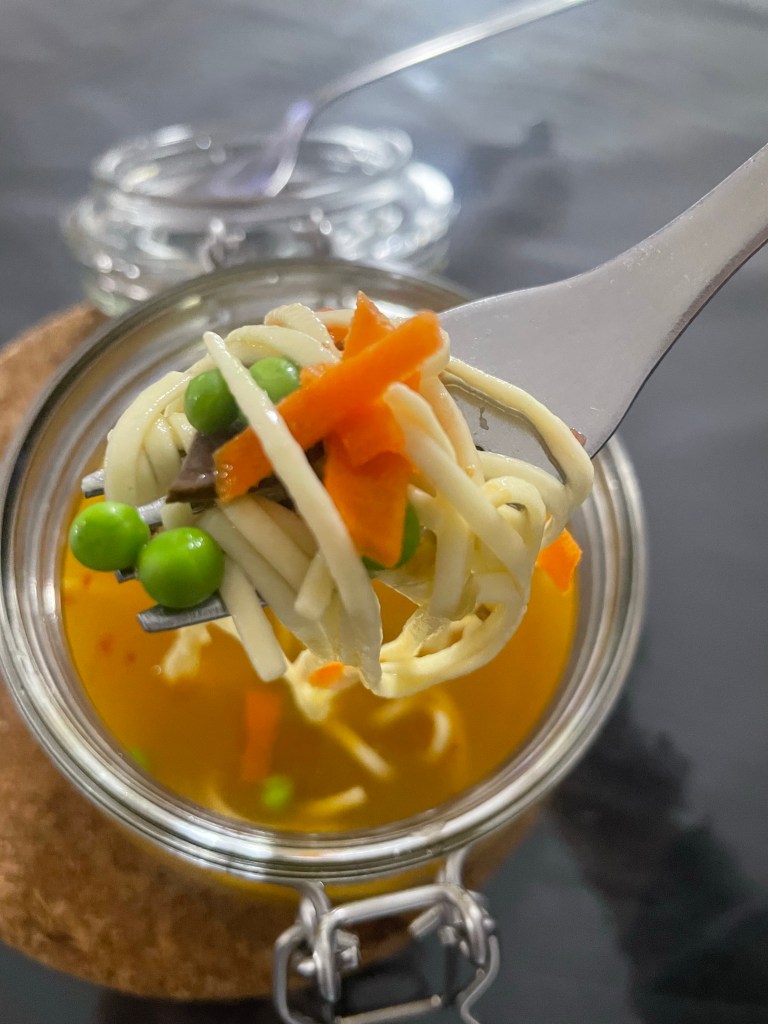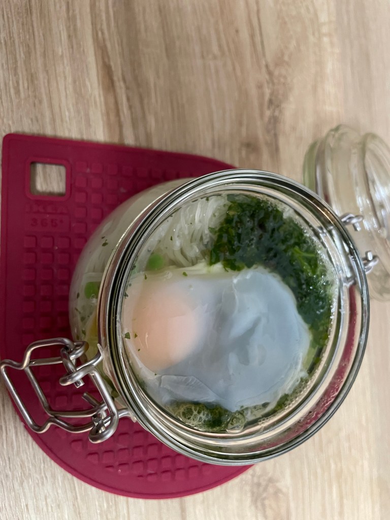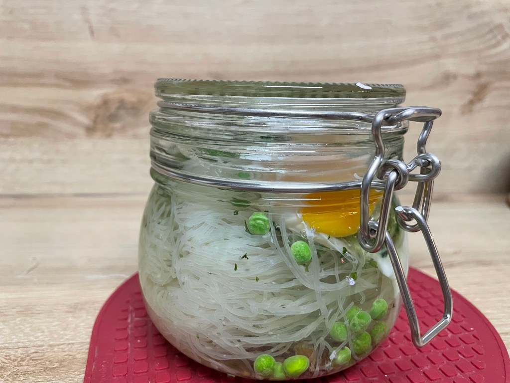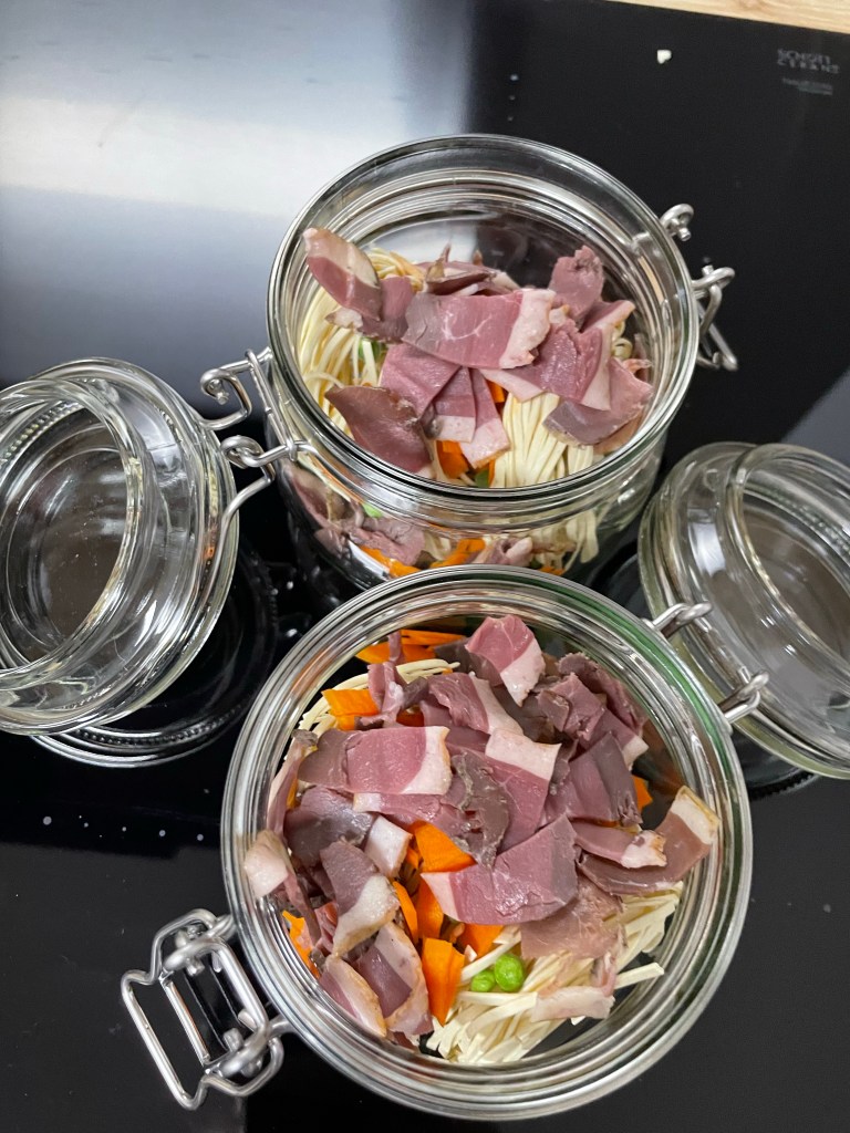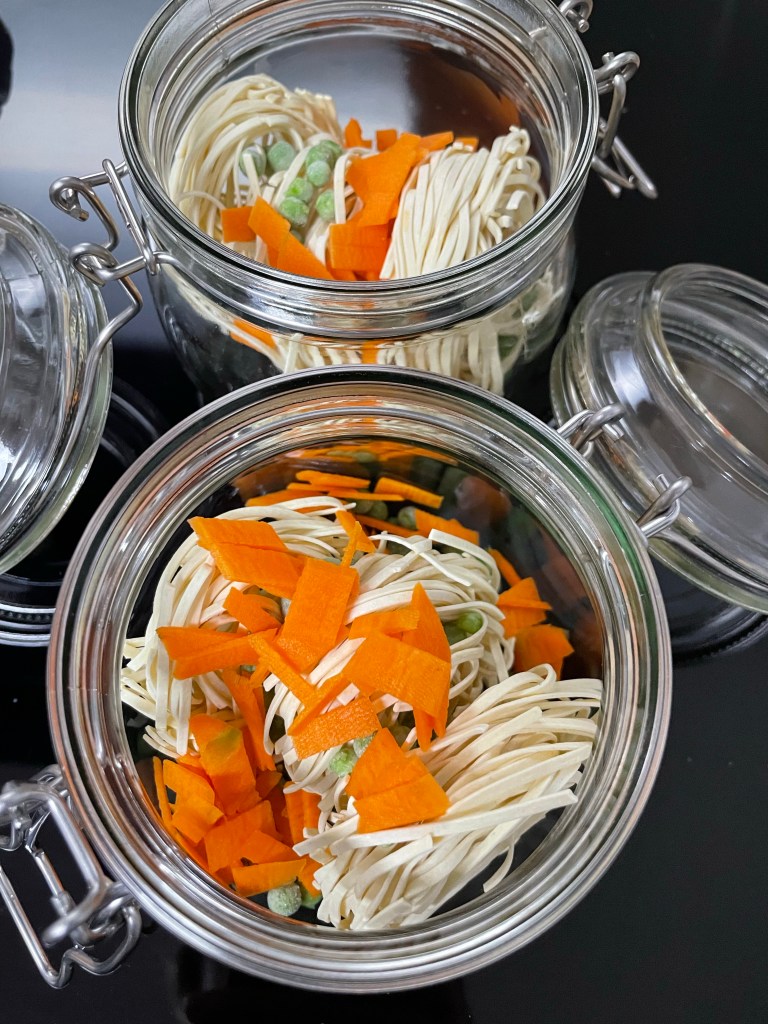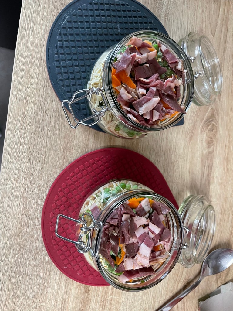 Il suffit de déposer une cuillère à café de pâte d’épices au fond de votre bocal, disposez ensuite des vermicelles de riz ou des nouilles et agrémentez selon vos envies ( et les fonds de placard): des petits pois surgelés, de la julienne de carotte, des champignons, du poulet rôti, du magret de canard séché fumé ou encore de l’œuf, des oignons nouveaux, un peu de coriandre ou d’aneth, le jus d’un demi citron vert (ça apporte vraiment un petit plus, comme mes herbes aromatiques) . Votre repas est prêt vous pouvez même préparer vos bocaux de la veille et il ne vous restera plus qu’à verser de l’eau bouillante, refermer et attendre 4 minutes.