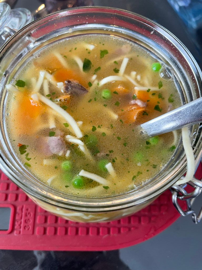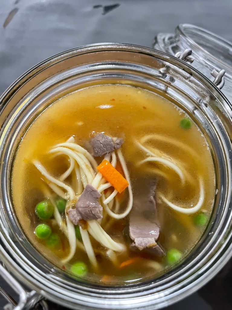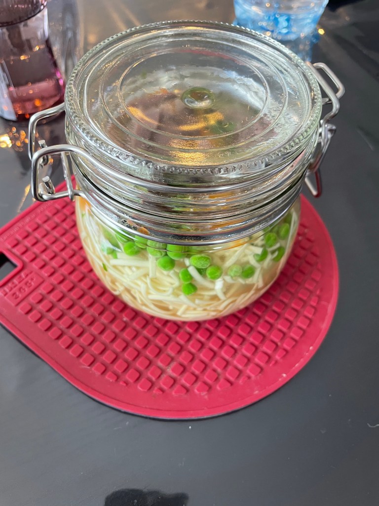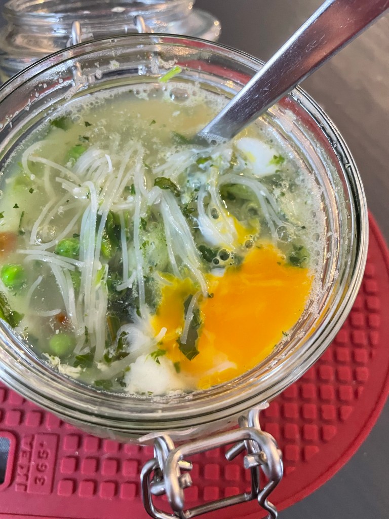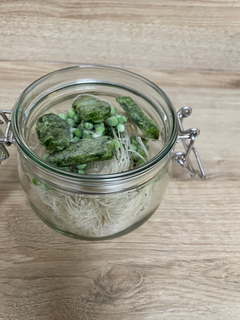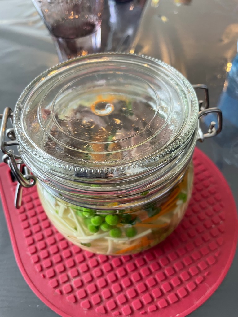 Il suffit de déposer une cuillère à café de pâte d’épices au fond de votre bocal, disposez ensuite des vermicelles de riz ou des nouilles et agrémentez selon vos envies ( et les fonds de placard): des petits pois surgelés, de la julienne de carotte, des champignons, du poulet rôti, du magret de canard séché fumé ou encore de l’œuf, des oignons nouveaux, un peu de coriandre ou d’aneth, le jus d’un demi citron vert (ça apporte vraiment un petit plus, comme mes herbes aromatiques) . Votre repas est prêt vous pouvez même préparer vos bocaux de la veille et il ne vous restera plus qu’à verser de l’eau bouillante, refermer et attendre 4 minutes.