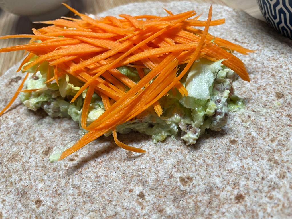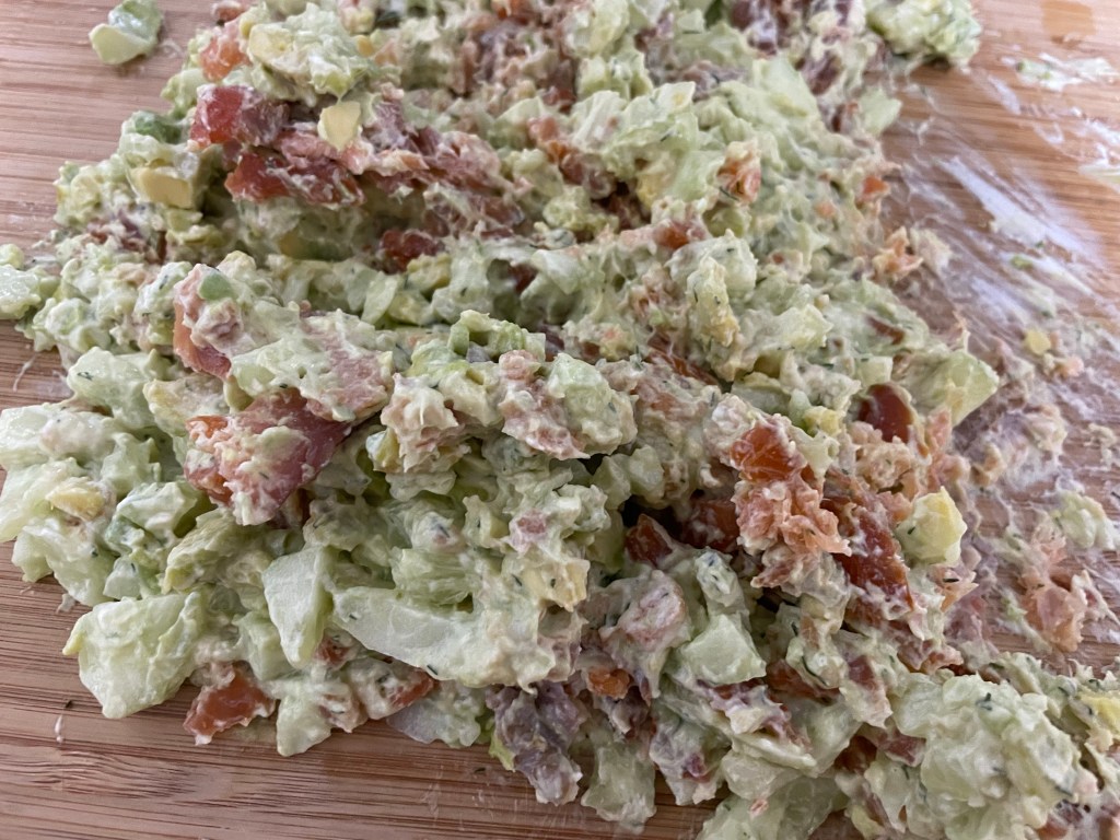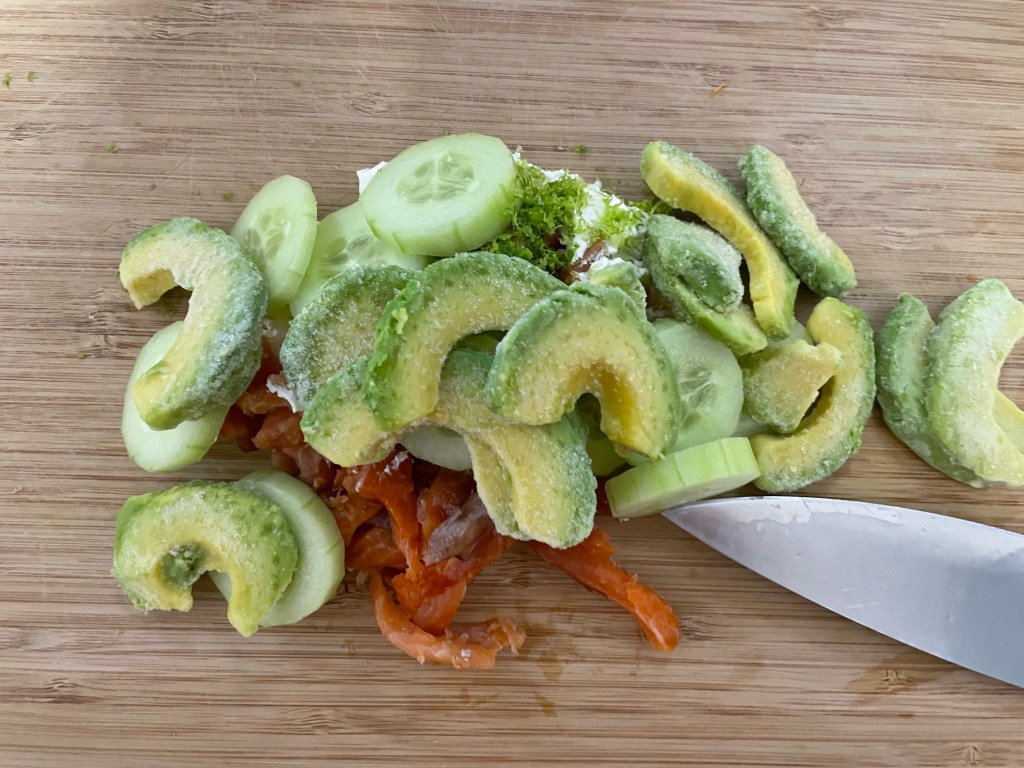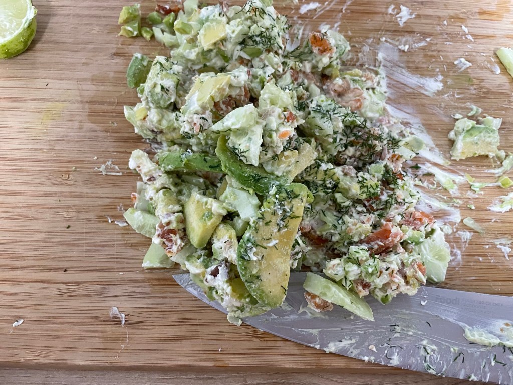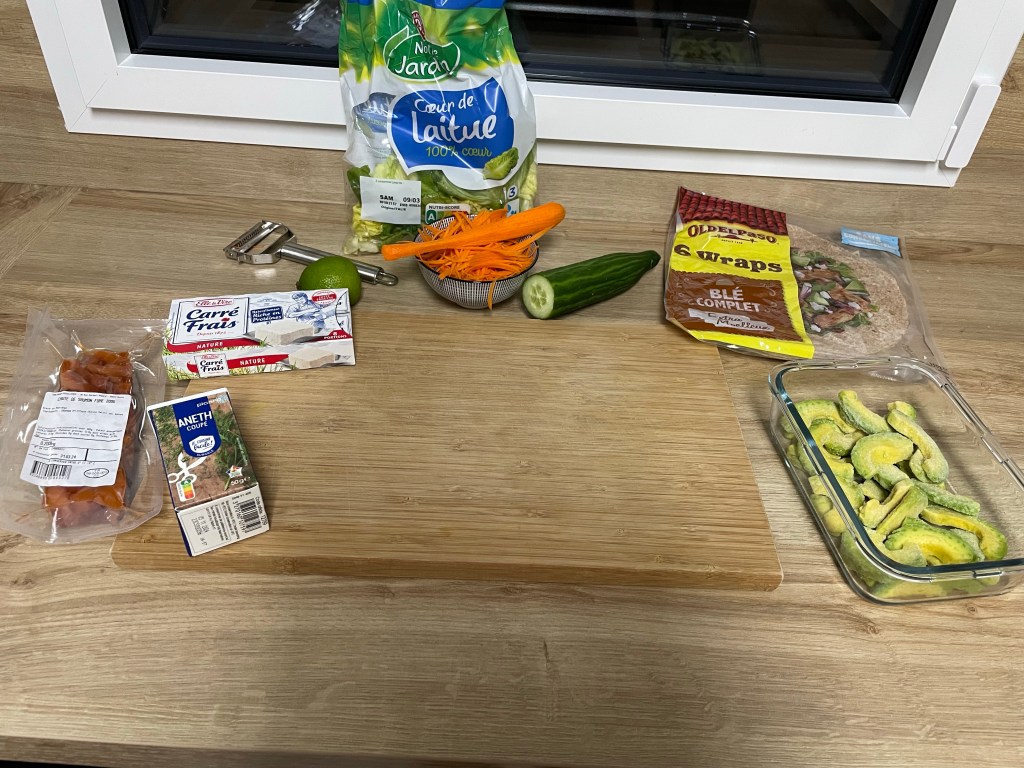 On hache tout avec du carré frais sur une grande planche à découper avant et on garni un wrap, ou un bagel 🤗.