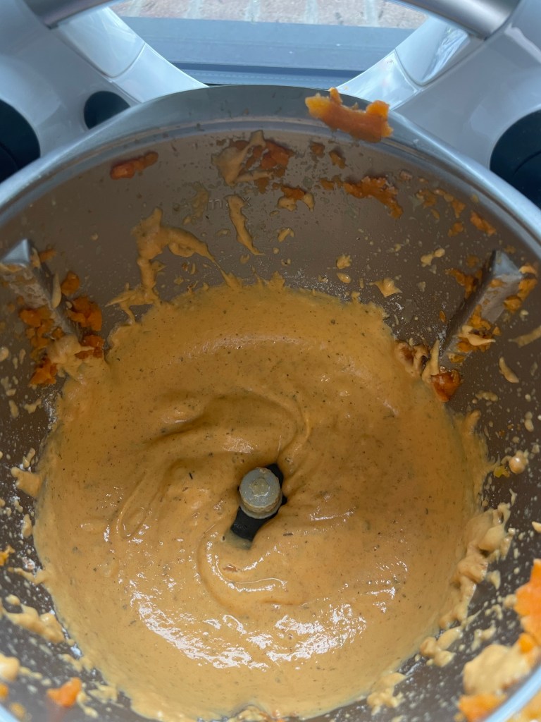 - Placer les carottes cuites dans le bol du Thermomix puis mixer 1 minute / vitesse 6. Racler les parois du bol à l’air de de la spatule