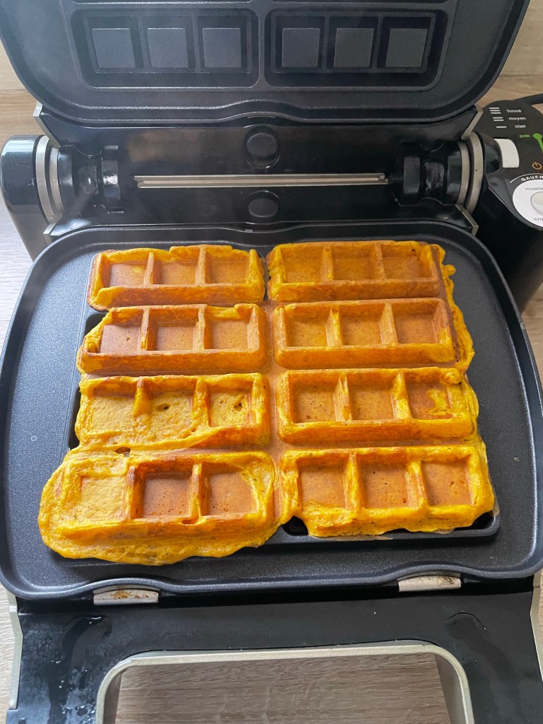 - Cuire dans un gaufrier ( mettre de bonnes cuillères à café de pâte à gaufres)
