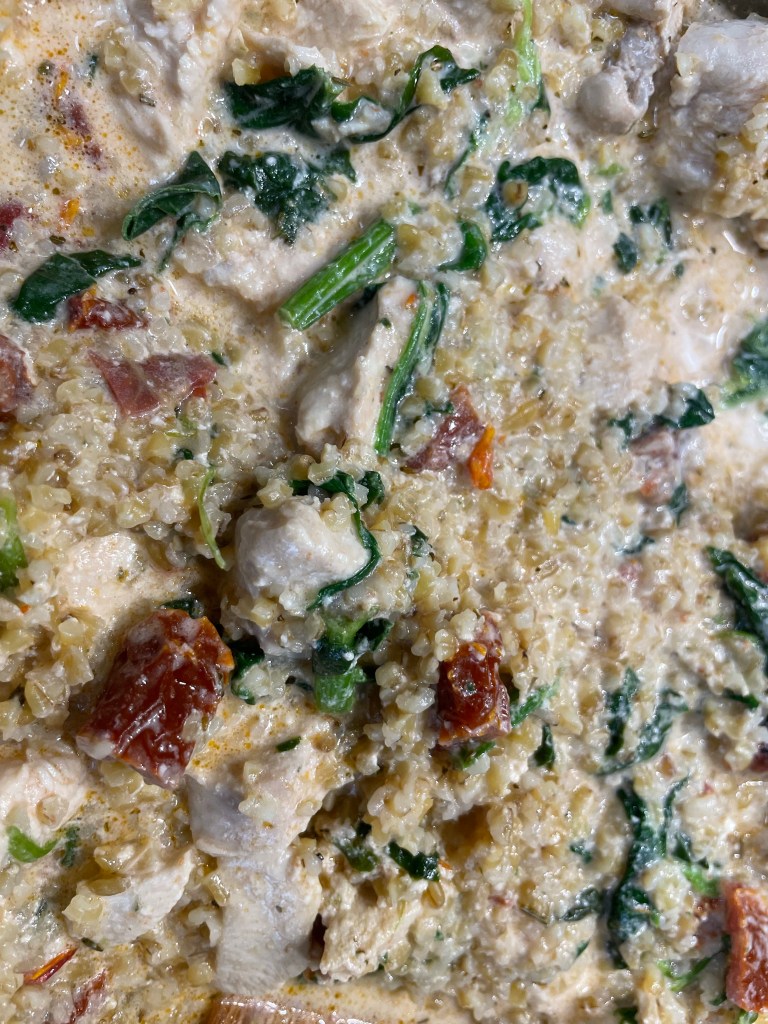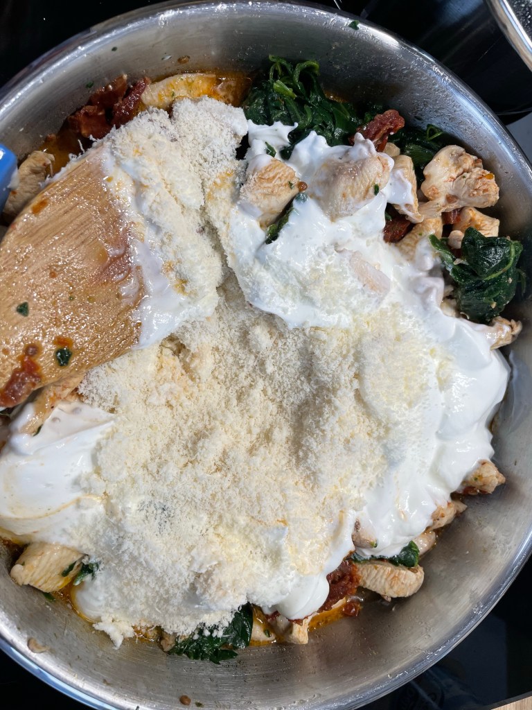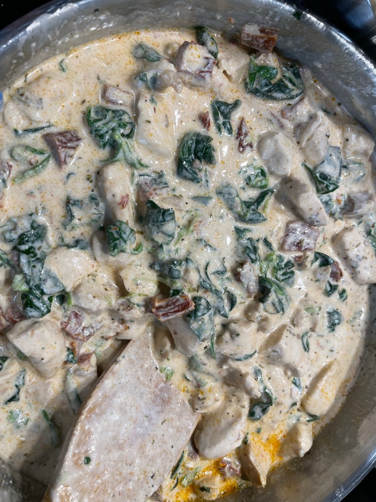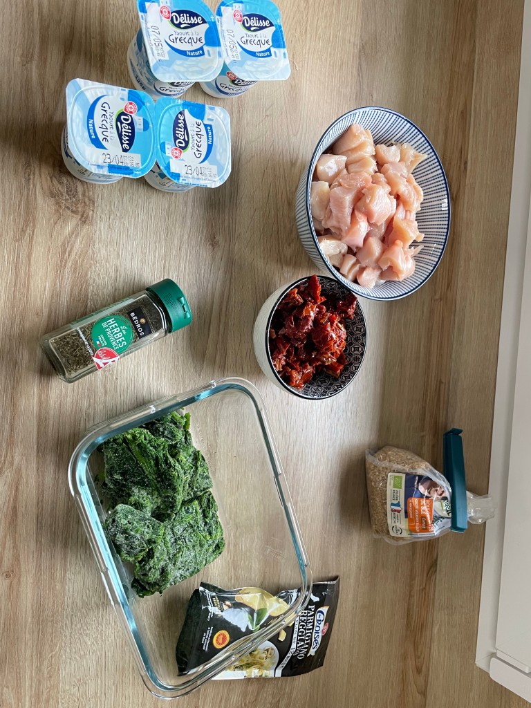 Aujourd’hui je vous propose une recette rapide qui ressemble un peu à la recette du poulet à la toscane mais sans pâtes et avec une sauce plutôt légère car à base de yaourt à la grecque ( ma base en remplacement de crème)