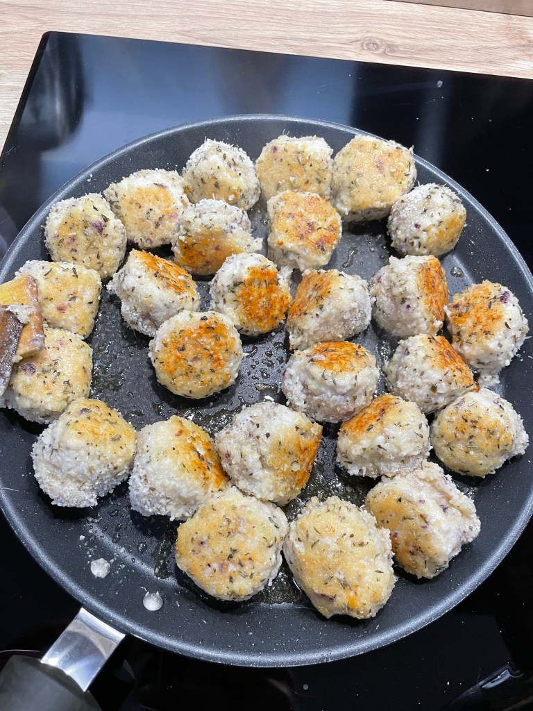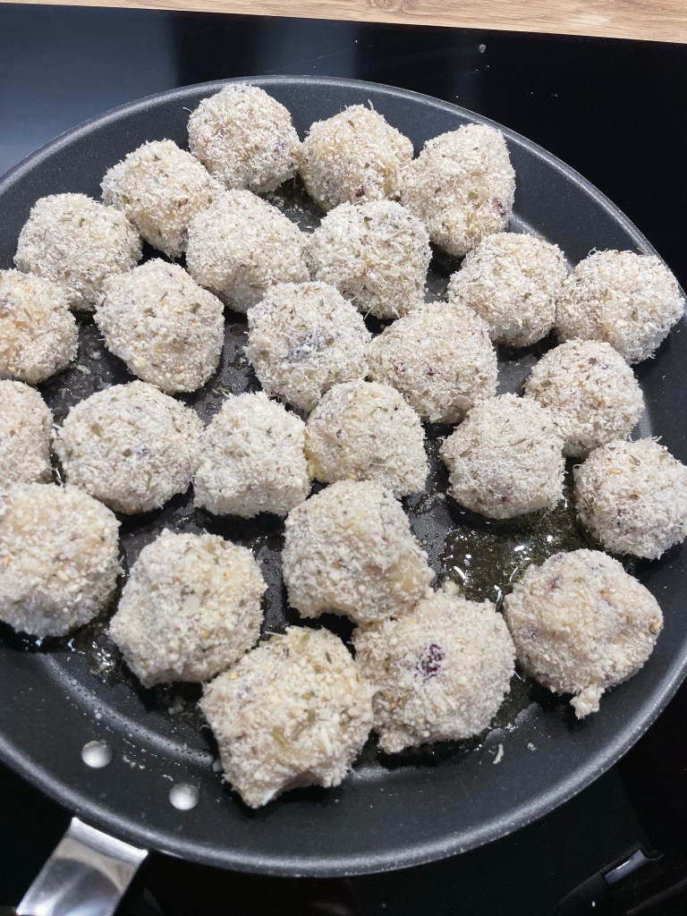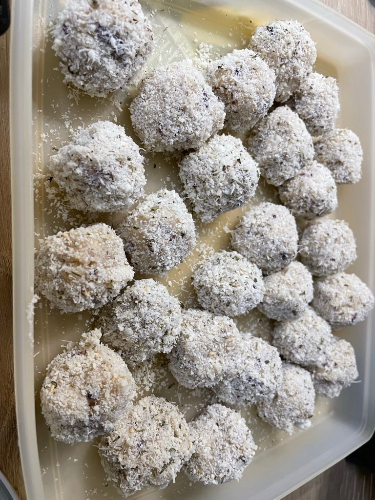 - A l’aide d’une cuillère à café, former une vingtaine de boulettes et les rouler dans la préparation chapelure, parmesan a herbe de Provence t placer sur une assiette ou un plat