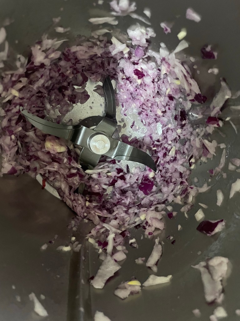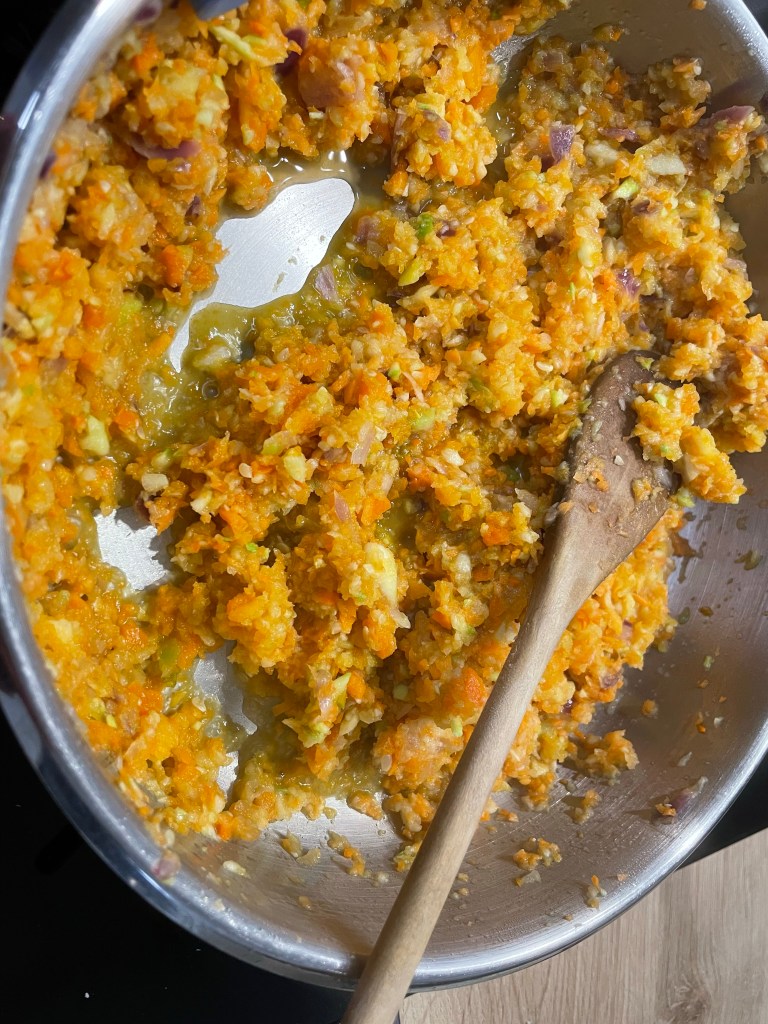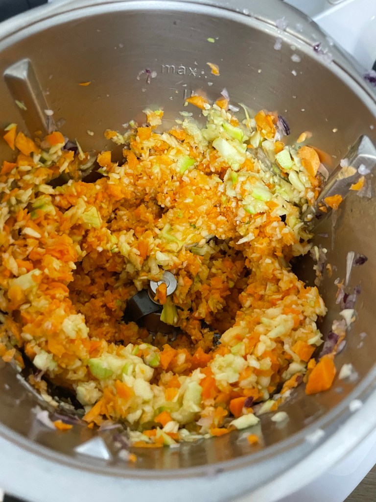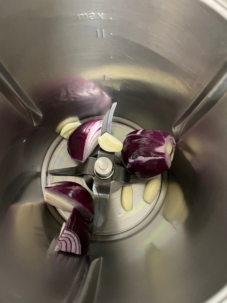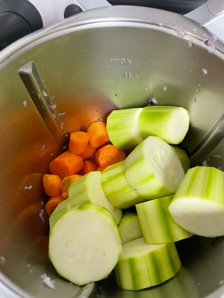 - Eplucher l’oignon et les gousses d’ail, dégermer les gousses d’ail. Éplucher les carottes et les courgettes et les couper en petit morceau ( ou même plutôt hachez les : je mets tout 3 secondes vitesse 6 dans le Thermomix)