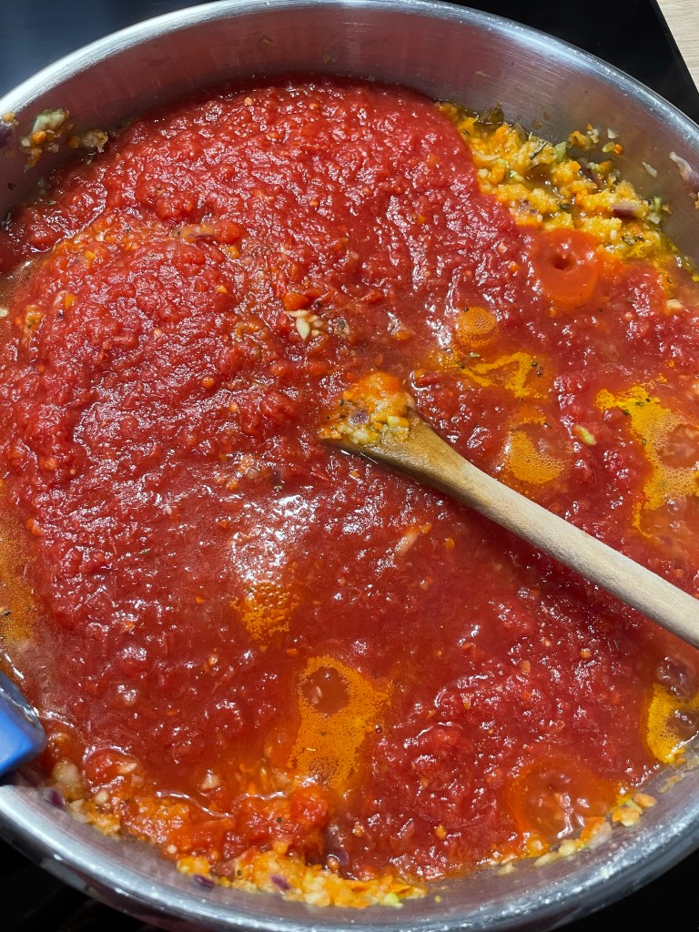 - Ajouter la pulpe de tomate, les herbes et les épices et laisser mijoter une trentaine de minutes