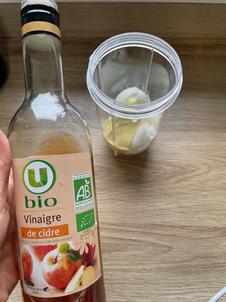 - 1 cuillère à soupe de vinaigre de cidre ( ou autre vinaigre plutôt neutre)