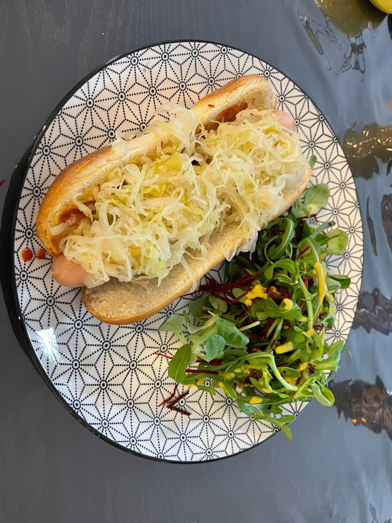 Et voilà une recette, ou un assemblage très simple je dirais. Pour le coup je vous donne juste une idée de repas qu’on ne pense pas forcément à préparer. Et sincèrement je trouve cela très bon. C’est une bonne alternative au hot dog frites, la choucroute cuisinée donne un petit goût sympa bien alsacien 😉.